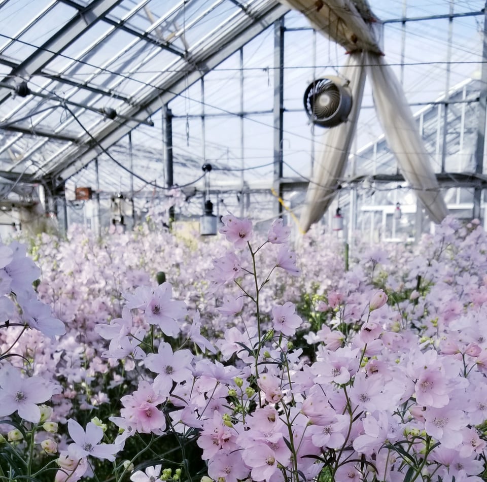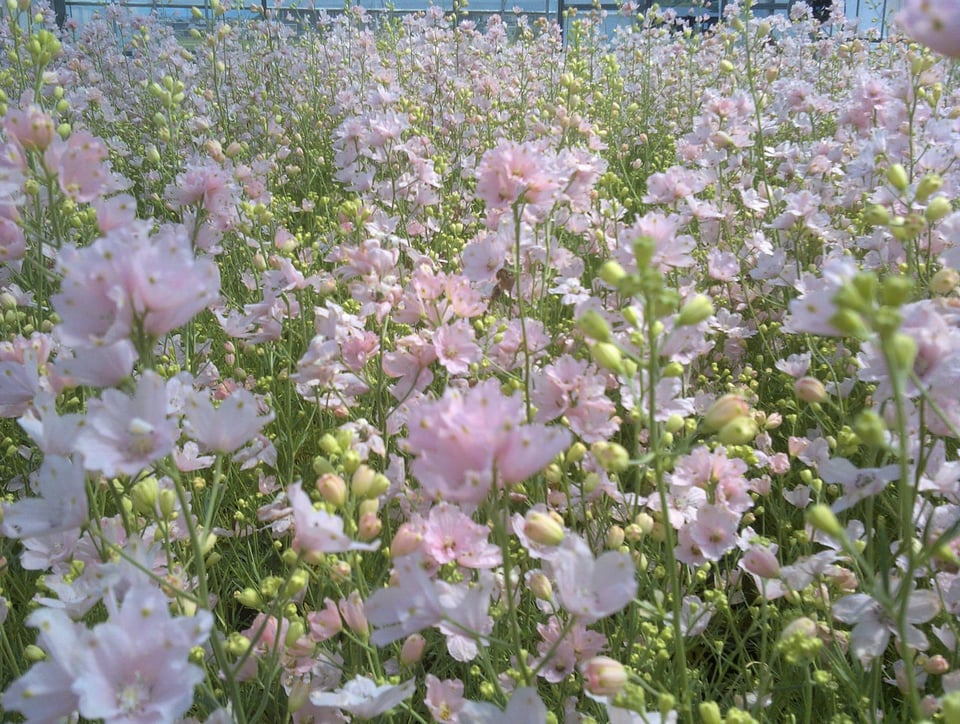 愛媛県が育成したデルフィニウム「さくらひめ」は、桜のような淡いピンク色が特徴で、結婚式や卒業式などのお祝いシーンに加え、母の日の贈り物としても人気があり、これから出荷の最盛期を迎えます。
