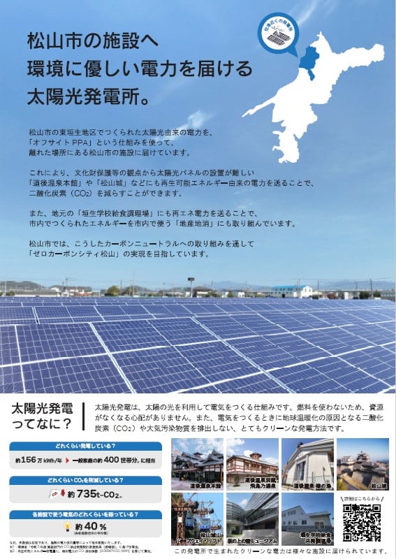 松山城、松山城山ロープウェイ・リフトは、持続可能な観光施設を目指し、令和8年3月からオフサイトPPAという仕組みを使って、松山空港周辺に設置した太陽光発電施設でつくられた再エネ電力の利用を開始しました。